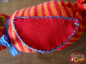 Coloque mais fibra, para formar o corpo. Em seguida, amarre depois do calcanhar. A parte de cima da meia forma o rabo do passarinho.